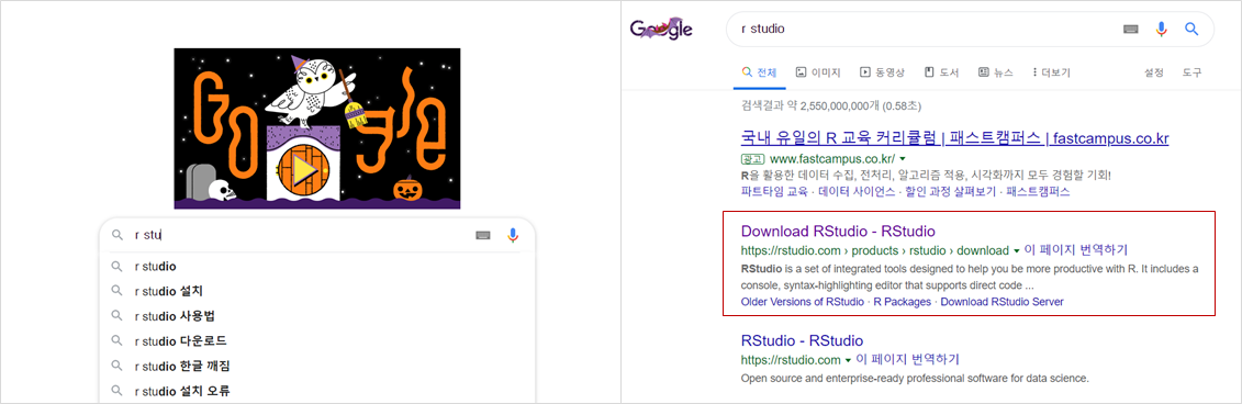 1. R 프로그램 설치와 마찬가지로 구글에서 R Studio를 검색하면 아래와 같이 맨 처음에 링크가 나타나는데 이때 해당 링크를 클릭하여 설치 페이지를 이동한다.