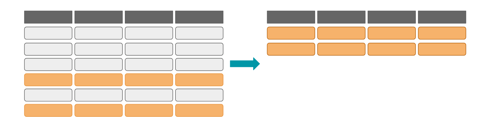 실제 데이터를 분석할 때 일반적으로 데이터 전체를 사용하여 분석하기도 하지만 분석 목적에 따라 데이터의 일부를 추출해 분석하기도 한다. filter( ) 함수는 주어진 조건에 따라 데이터의 일부 케이스(행)를 추출할 때 많이 사용한다. 아래 그림의 예시와 같이 여러 케이스(행)에서 특정 조건(오렌지색)에 케이스(행)를 추출할 때 유용하게 적용할 수 있다. 아래 구체적인 예시를 통해 특정 조건을 설정하는 여러 방법에 대해 설명하고자 한다.